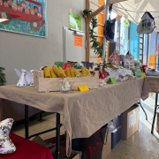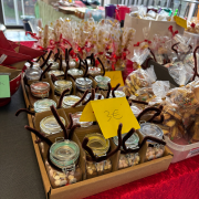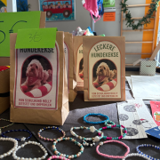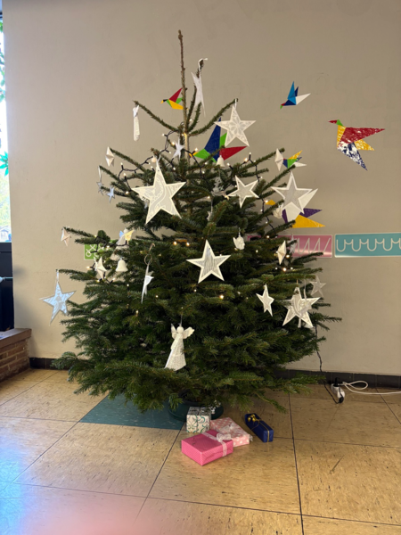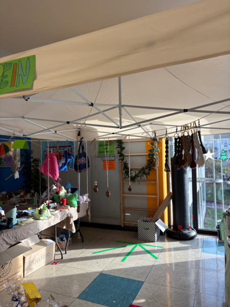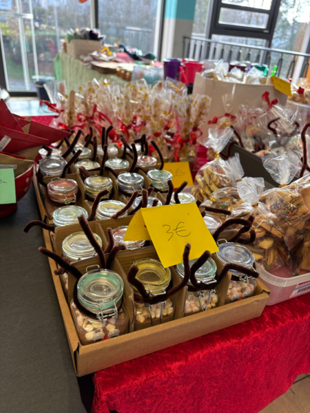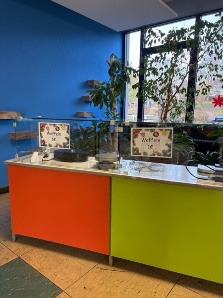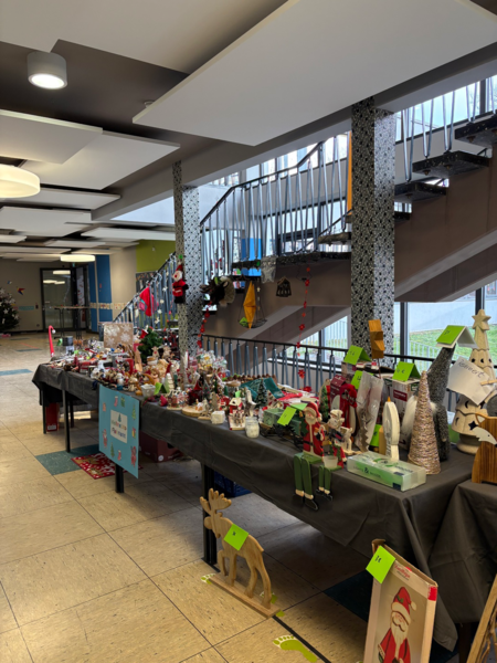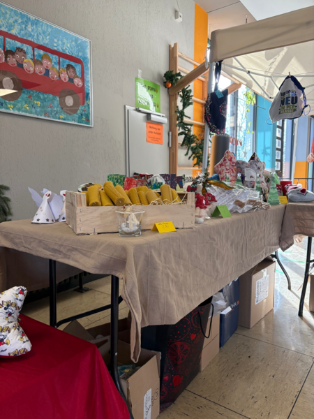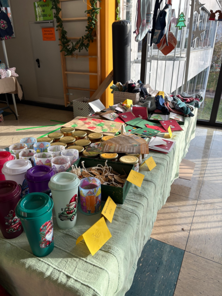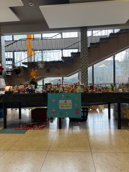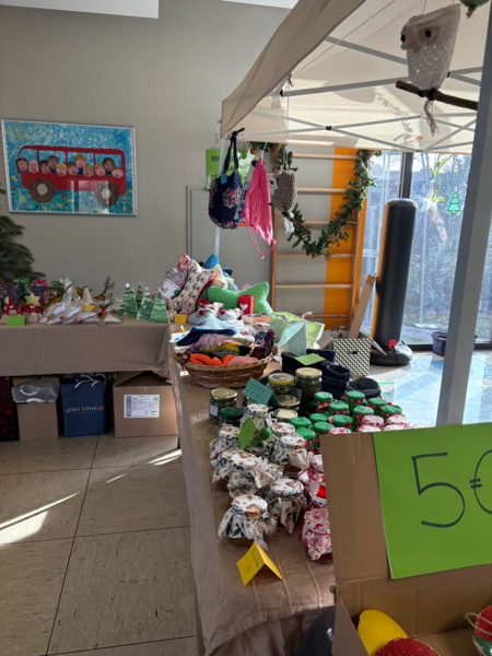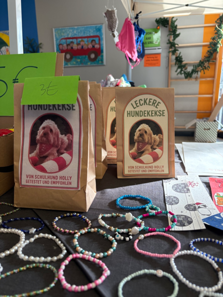 Im Anschluss lud das Schulhaus zum gemütlichen Beisammensein ein. Für das leibliche Wohl war bestens gesorgt: Frisch gebackene Waffeln und heißer Punsch fanden großen Anklang bei Groß und Klein. Ein Flohmarkt mit liebevoll ausgewählter Weihnachtsdekoration bot Gelegenheit zum Stöbern, während an einem weiteren Stand selbstgemachte Produkte von Schülerinnen und Schülern, Lehrkräften sowie Eltern angeboten wurden. Hier reichte das Angebot von kulinarischen Leckereien wie Bruchschokolade, Marmelade und Chutney bis hin zu handwerklichen Arbeiten wie Genähtem, Gehäkelt- und Gestricktem. Und auch ein kleines Angebot für Hunde war vorbereitet: Leckerlis und Schnüffelteppiche; natürlich von Schulhund Holly getestet und empfohlen.