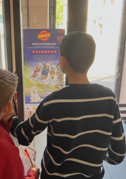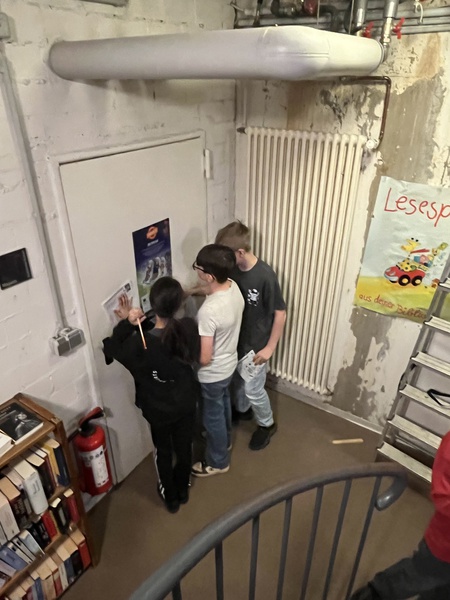Fr. Ziegler las uns dann noch den Anfang des Buches vor. Anschließend durften wir eine Schnitzeljagd durch die Bücherei machen. Wir mussten an fünf Stationen Rätsel lösen und das Lösungswort auf dem Lösungsblatt eintragen. Die Stationen hatten alle mit dem Buch zu tun.