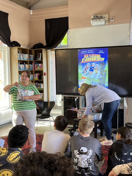 Um 9:15 Uhr startete unser Weg nach Sulzbach zur Stadtbibliothek. Zuerst begrüßten uns Frau Ziegler und Frau Bohr. Sie stellten uns den Comic-Roman „Der fliegende Klassenscooter“ vor.