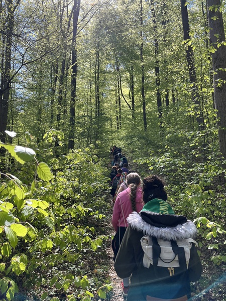 Anschließend ging es zur Frühstückspause auf den Spielplatz und danach wanderten alle bei bestem Frühlingswetter durch den Wald zurück zur Schule.