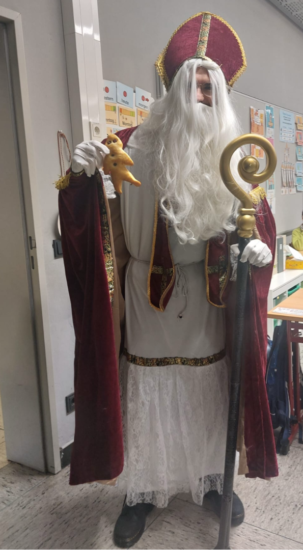 Heute erwartete die Schülerinnen und Schüler jedoch eine ganz besondere Überraschung: Der Nikolaus kam persönlich vorbei und erzählte die Geschichte des Nikolaus! Mit großem Staunen und leuchtenden Augen nahmen die Kinder ihre Weckmänner entgegen, die er an jede Klasse verteilte.